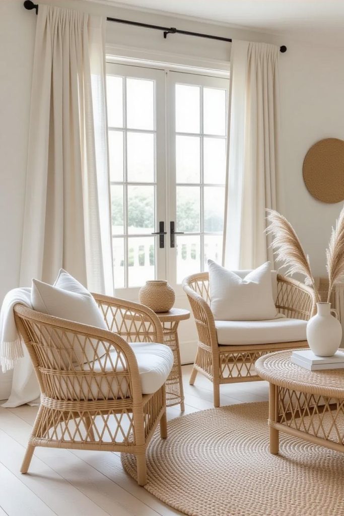 This room is fun and cozy. It has chairs made of rattan. The colors are soft like pink and cream. It looks cool and calm.