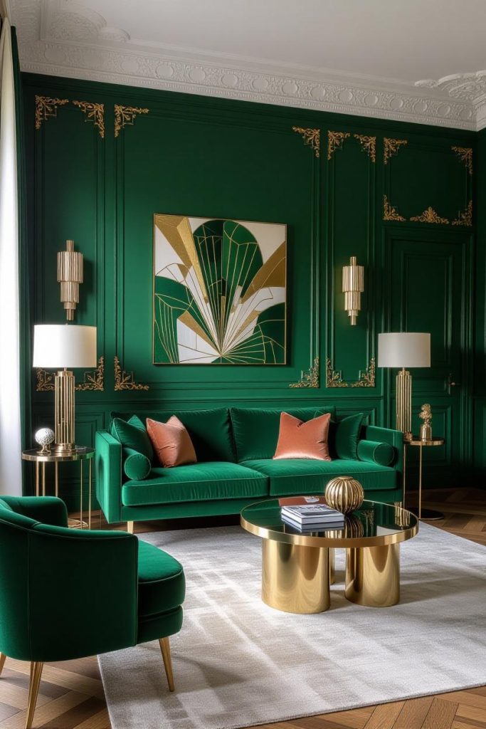 This room is shiny and rich. The walls are dark green. The couch is soft velvet. The table is gold. It feels like a movie house