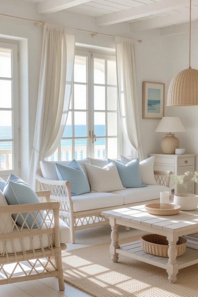 This room feels like the beach. The colors are blue and white. The curtains blow in the wind. It looks soft and happy, like a house near the sea.