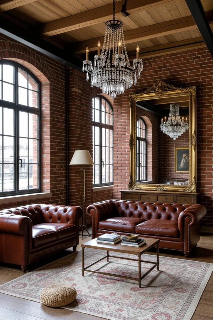 This room looks cool and strong. The walls are made of bricks. The windows have black lines. The couch is brown leather. There is a shiny light on top. It feels old and new at the same time.