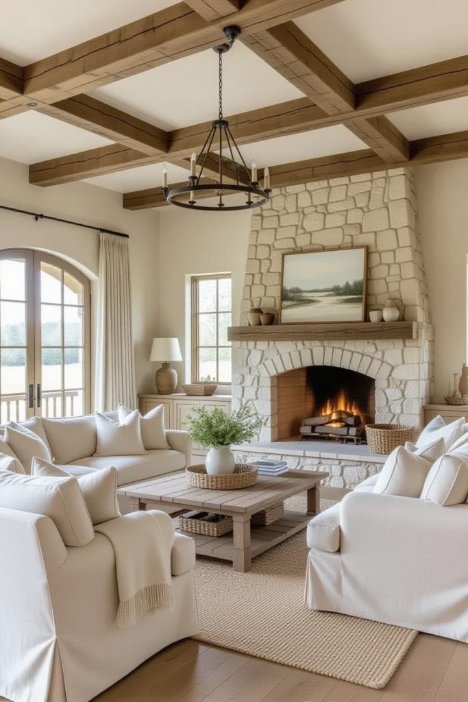 This room feels warm and cozy. The roof has big wooden beams. The couch is soft and white. The fireplace is made of stone. It looks like a country home in France.